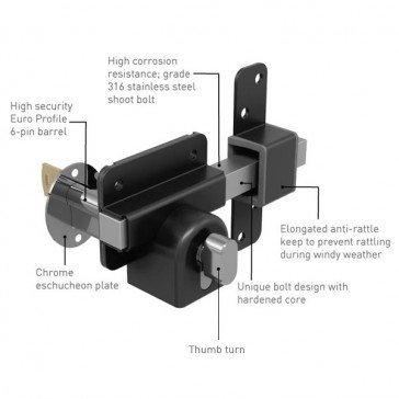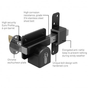 Suitable for use with gates, sheds and garage doors, the new euro profile long throw lock offers many advantages over the existing model, high security euro profile 6-pin barrel (supplied with 5 keys) – allowing the flexibility to go to any approved key cutting company to duplicate keys. High corrosion resistance – grade 316 stainless steel shoot bolt. Elongated anti-rattle keep to prevent rattling during windy weather. Unique bolt design with hardened core and chrome escutcheon plate. Drill bits and stainless steel security screws included.