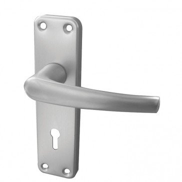 Satin aluminium budget lever door handle on lock back plate. Supplied with fixings.