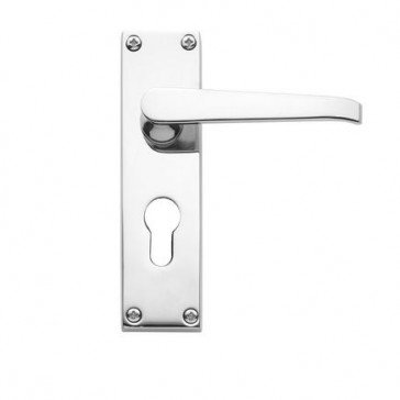 Victorian straight lever door handle on euro back plate. Polished chrome plated brass. Manufactured by JEDO. Supplied boxed with fixings.