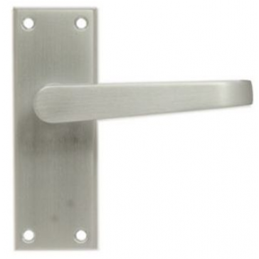 Satin chrome on brass, lever door handle on short back plate. Manufactured by JEDO. Supplied boxed with fixings.