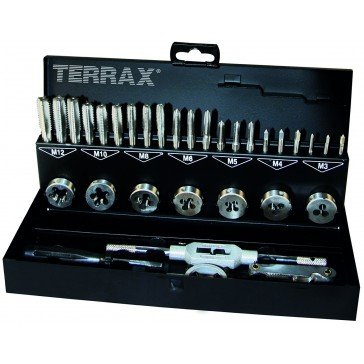LSUNR073 RUKO TERRAX HSS HAND TAP SET OF 31 • 31 piece hand tap & dies set with tools • Contains one three-piece set of hand taps DIN 352 HSS M3, M4, M5, M6, M8, M10 & M12 • Also comes with Round dies DIN EN 22568 HSS M3, M4, M5, M6, M8, M10 & M12 & die stock DIN 225 25 x 9mm, 1 tap wrench DIN 1814 size 1 1/2 and 1 screwdriver • Supplied in a Steel case