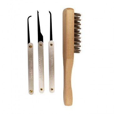 The Burr Aid Kit includes x3 picks for removing debris from the keyway and a stainless steel wire brush for cleaning off deposits from burrs.