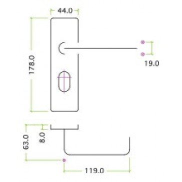 | Size/Dimensions | Back plate – 44mm x 178mm / Centres 48.5mm / Lever – 119mm x 19mm dia / Projection (to outside of handle) – 63mm |