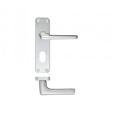 Satin aluminium budget lever door handle on oval back plate. Supplied boxed with fixings.